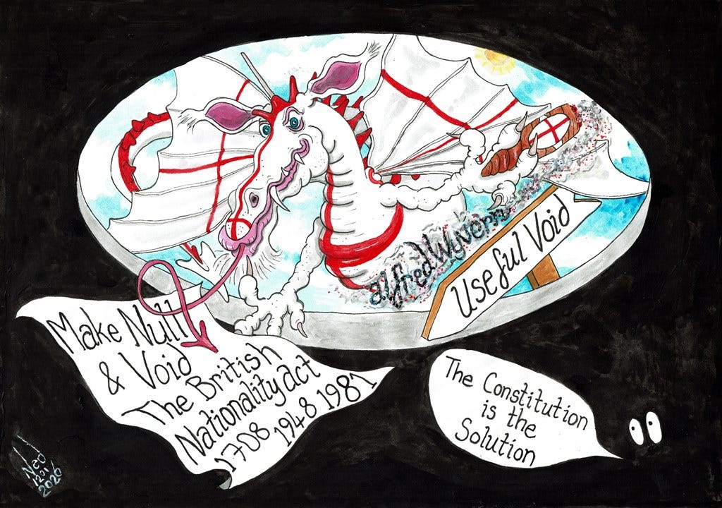 GOO is Government Of Occupation. Alfred Wyvern had had enough. He was named after King Alfred the Great and rose up from annals of history to once again to help save the English from invasion. Alfred Wyvern peered down into the void and discarded the British Nationality Act; to be confined to the trash can of silly clown world codswallop never to return again… I’m day dreaming; if only.